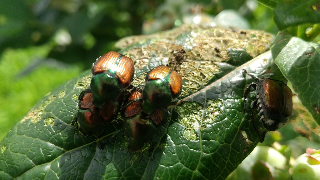 今までにない程のコガネムシの大群が葉っぱや実を食害していたので、ここ数日は手で捕殺していましたがとても人の手で駆除できるレベルではなくなってきました、異常発生です。